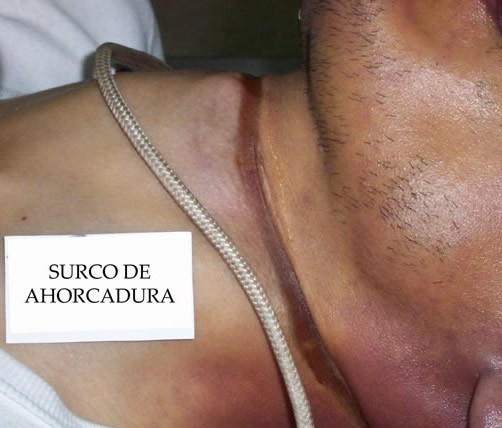 - SURCO DE AHORCADURA: PRODUCIDA POR LA PRESION SOSTENIDA DEL LAZO EN EL CUELLO POR EL PESO DEL CUERPO, SUELE REPRODUCIR LAS CARACTERISTICAS DEL LAZO EMPLEADO, SE UBICA POR ENCIMA DEL CARTILAGO TIROIDES Y ES DE DIRECCIÓN OBLICUA ASCENDENTE.EN ESTE CASO PRODUCIDO POR LAZO RIGIDO.