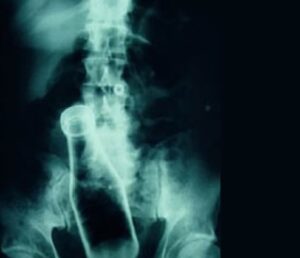 SE APRECIA AL EXAMEN RADIOGRAFICO PRESENCIA DE CUERPO EXTRAÑO (BOTELLA VIDRIO) EN REGION RECTAL Y COLON SIGMOIDES.